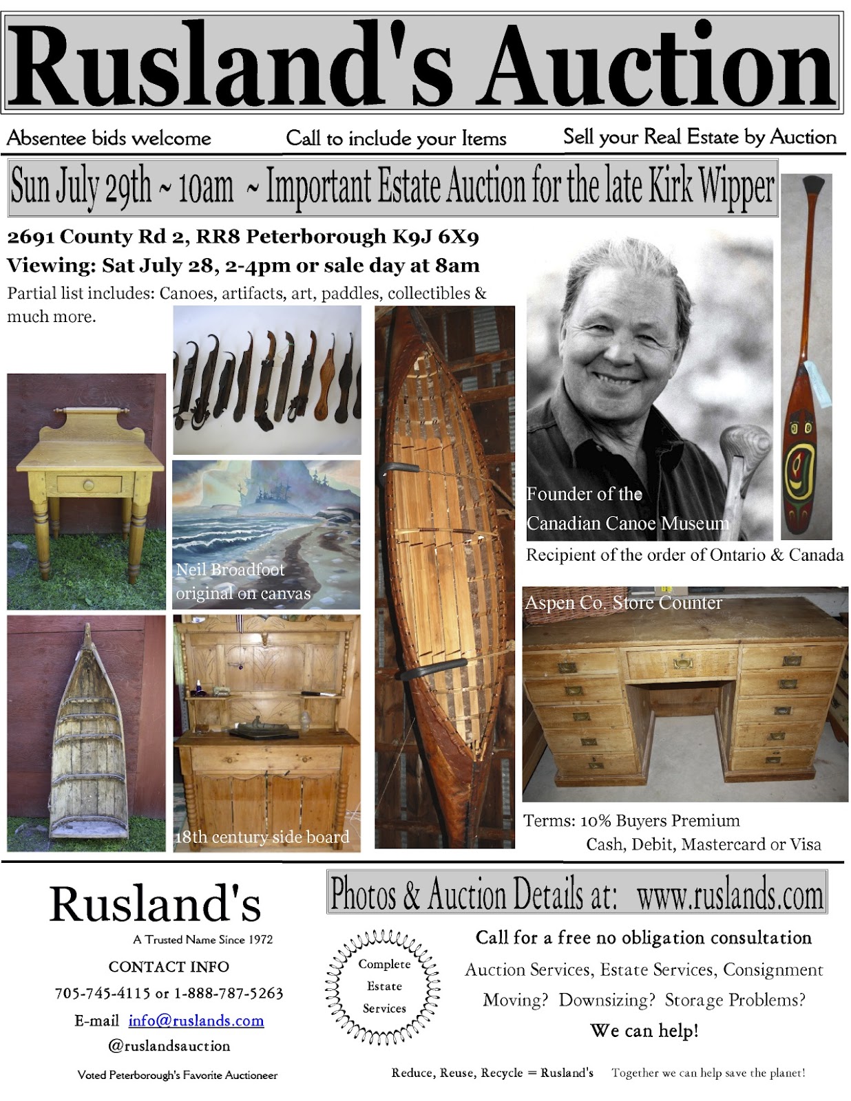 Please be sure to share this auction information as far and wide as is possible. Kirk Wipper, recipient of the Order of Canada and a founder of the Canadian Canoe Museum, had an extensive collection of the most interesting of objects. Many of them museum quality. This auction should definitely prove to be beyond interesting. Hopefully we will see you at the farm on Sunday July 29th!!!
